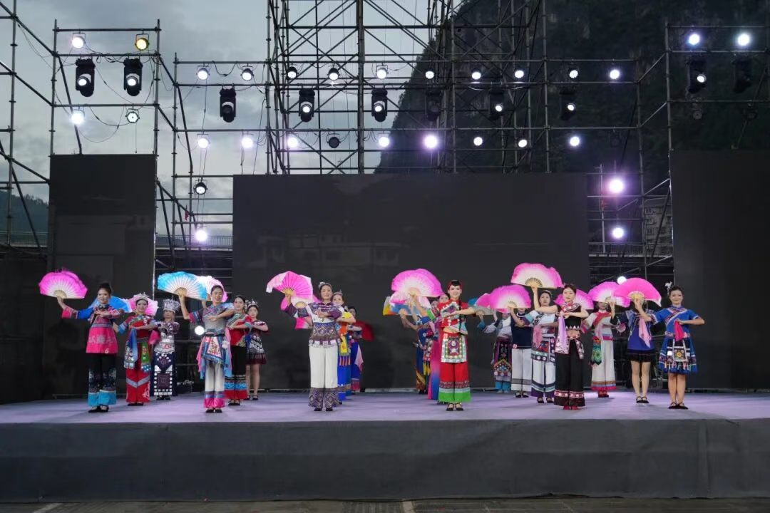姑娘们身着绣有花灯纹样、融入思南地域元素的服饰,手持思南非遗,步态从容优雅,每一步都似在演绎传统美学,举手投足间尽是东方韵味。