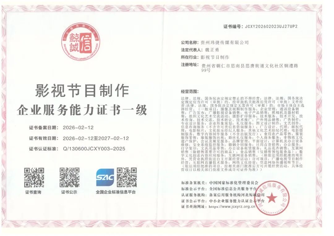 作为深耕贵州本土的传媒企业,贵州玮捷传媒自成立以来,始终聚焦影视节目制作、品牌策划、文化创意等核心领域,构建了从内容创作、拍摄制作到宣传推广的一体化服务体系。此次获得的一级认证,是对公司在影视制作技术、项目管理、服务质量及行业合规性等方面的高度肯定,也为公司在区域传媒市场乃至全国影视行业的深耕拓展奠定了坚实基础。